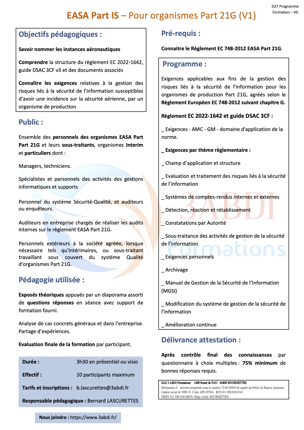 Apporter aux participants la connaissance de l’environnement réglementaire EASA et savoir appréhender les exigences et les privilèges relatifs à la PART IS pour organismes sous agrément Part21G.