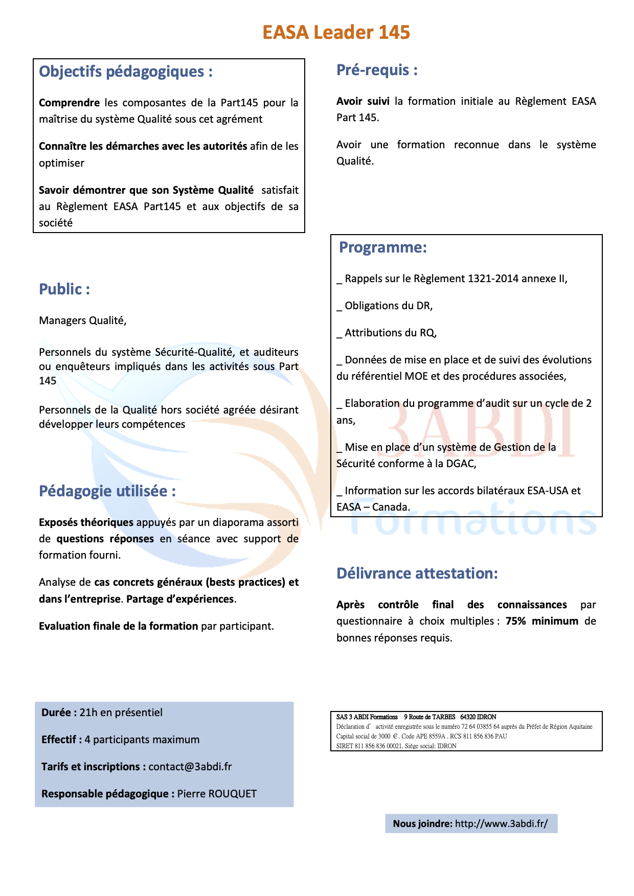 Le programme Leader 145 intègre également une revue d’ensemble des données nécessaires à la mise en place d’un système de gestion de la sécurité- SGS conforme aux exigences de la DGAC, ainsi qu’une information sur les accords bilatéraux Easa – USA, et Easa – Canada.